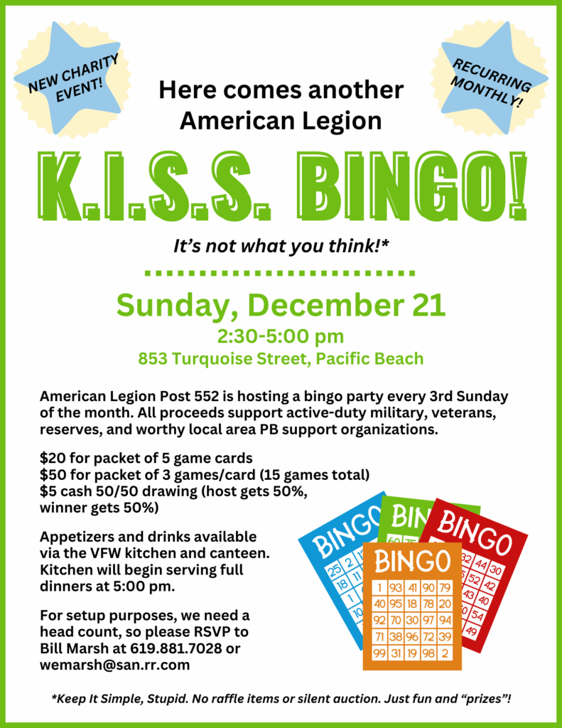 Our Pacific Beach American Legion family also includes American Legion Auxiliary Unit 552 and the Sons of the American Legion Squadron 552.