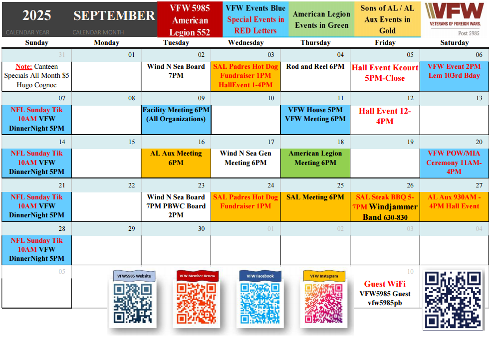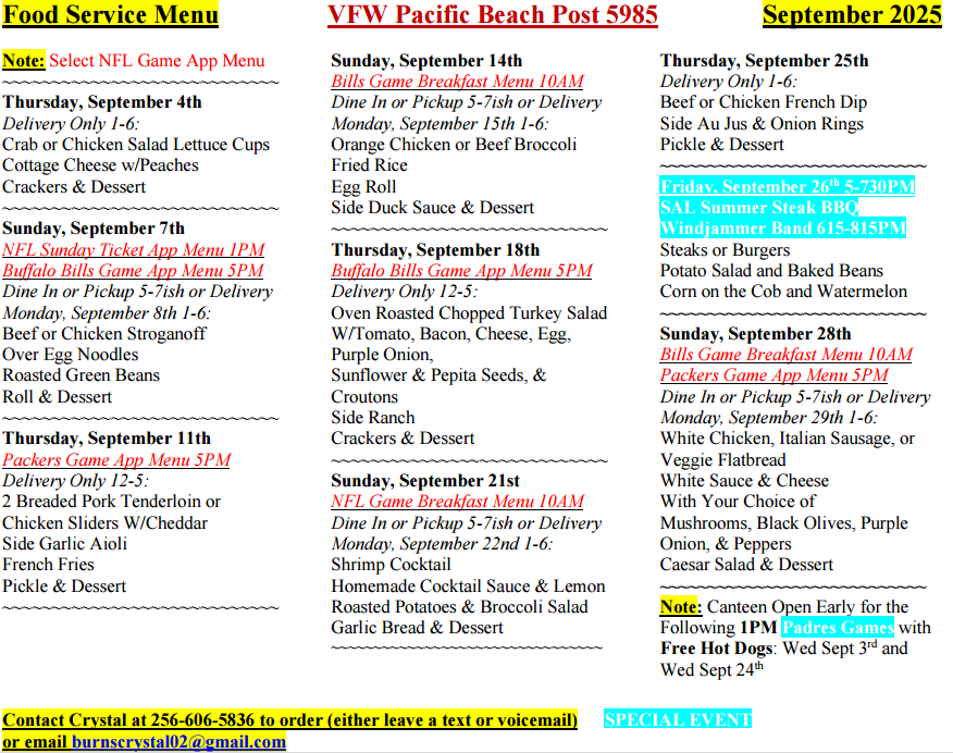 American Legion Post 552, VFW Post 5985, and our Pacific Beach affiliated groups often gather to share meals, fundraise, and enjoy each other’s company. We welcome our members and guests at the following events, at 853 Turquoise Street in Pacific Beach, San Diego, California.